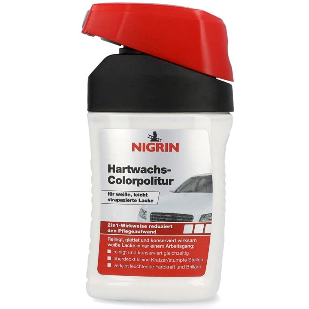 Немецкий белый одношаговый полироль с PTFE NIGRIN Hartwachs-Colorpolitur Weibe - это универсальный цвето обогощающий полироль-тефлон с частицами краски PTFE. Удаляет царапины, восстанавливает цвет кузова, подкрашивает огрехи лако красочного покрытия и защищает кузов воском с гидрофобным (водоотталкивающим) эффектом. Идеальное средство для того, чтобы быстро и качественно привести в порядок внешний вид автомобиля.