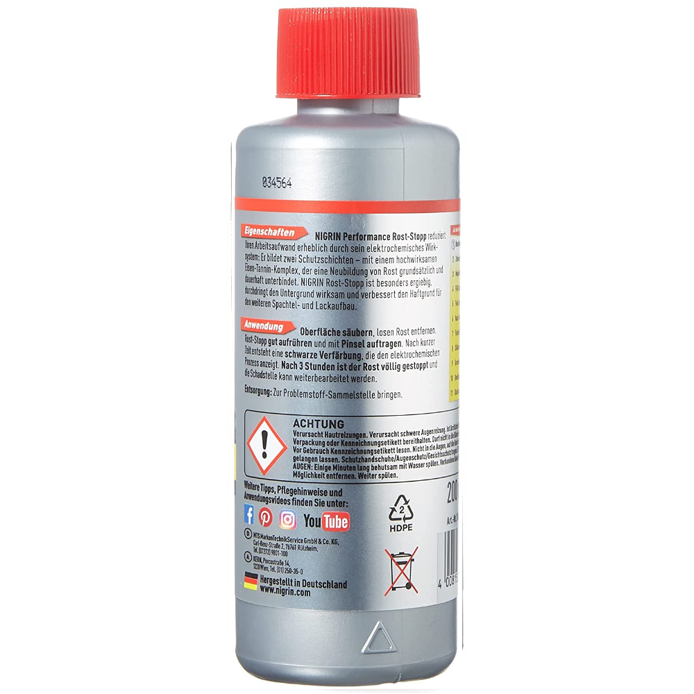 NIGRIN Rost-Stopp Rust-Stop значительно экономит Ваше время и снижает Вашу рабочую нагрузку при работе с ржавыми деталями, во время их реставрации. Благодаря своей электрохимической активной системе он работает автоматически, эффективно останавливает ржавчину и обеспечивает постоянную защиту от дальнейшей коррозии. Электрохимическая активная формула образует два защитных слоя - с высокоэффективным железо-таниновым комплексом, который принципиально и надолго предотвращает образование новой ржавчины. NIGRIN Rust-Stop особенно экономичен, эффективно проникает в основание металла и укрепляет его.