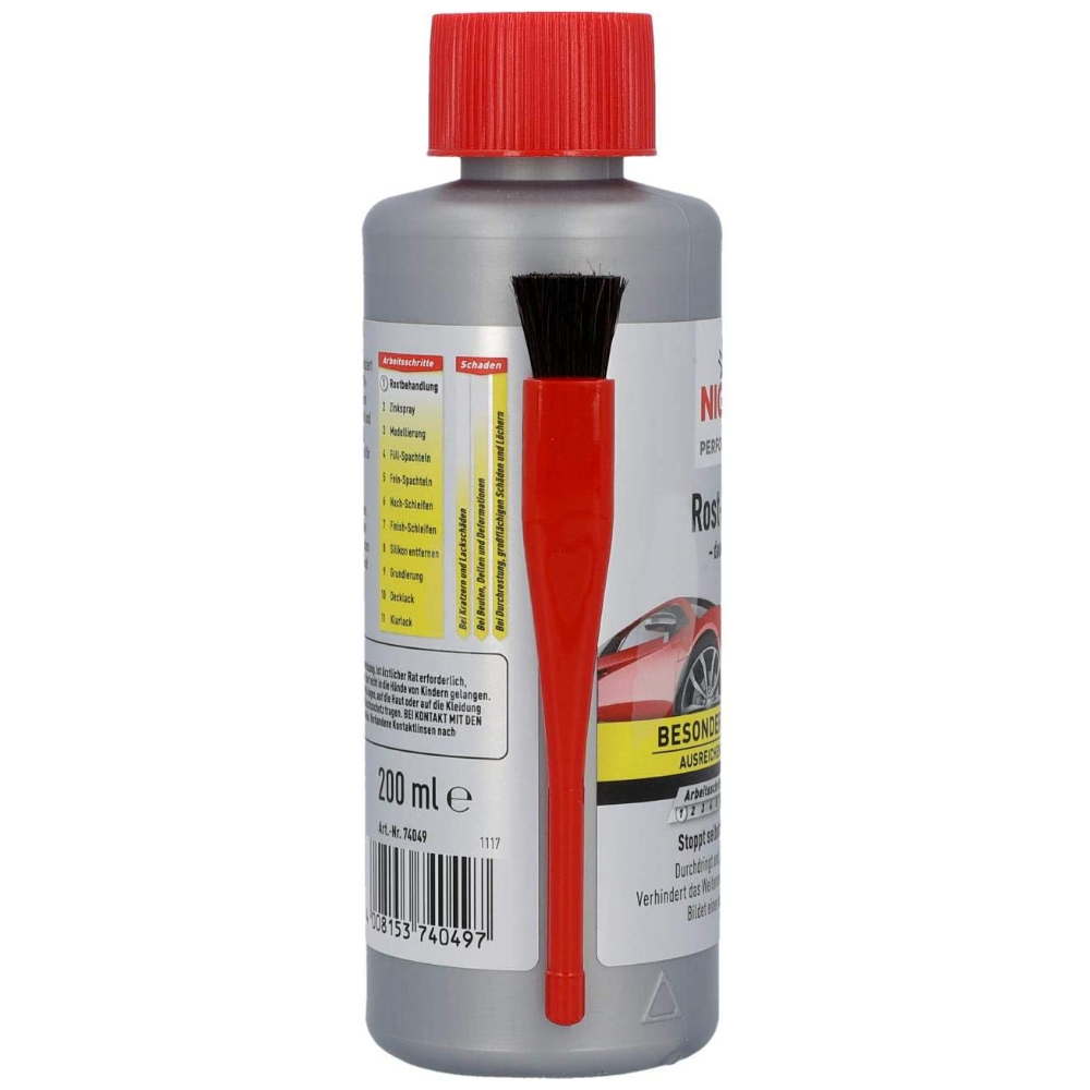 Немецкий высокоэффективный экономный быстрый 3-часовой удалитель ржавчины с индикатором и кистью NIGRIN Rost-Stopp в упаковке 200 мл. Лучшее средство по версии AutoBild для удаления ржавчины, также победитель многих тестов немецких автомобильных журналов и СМИ.