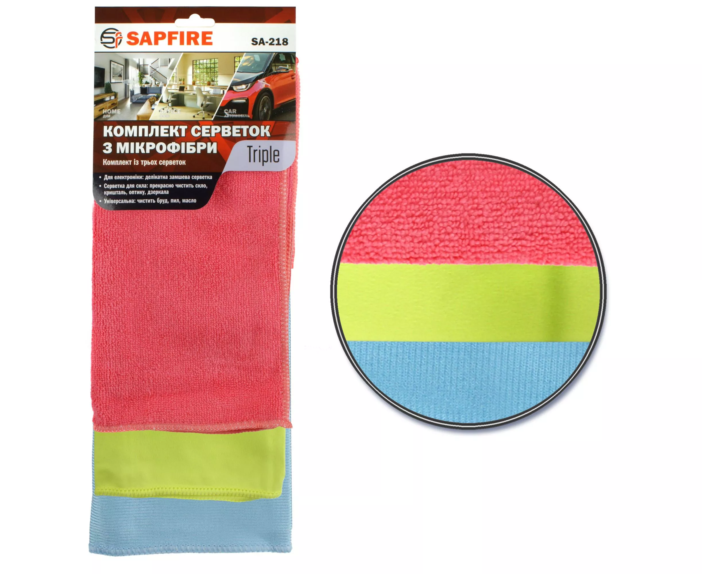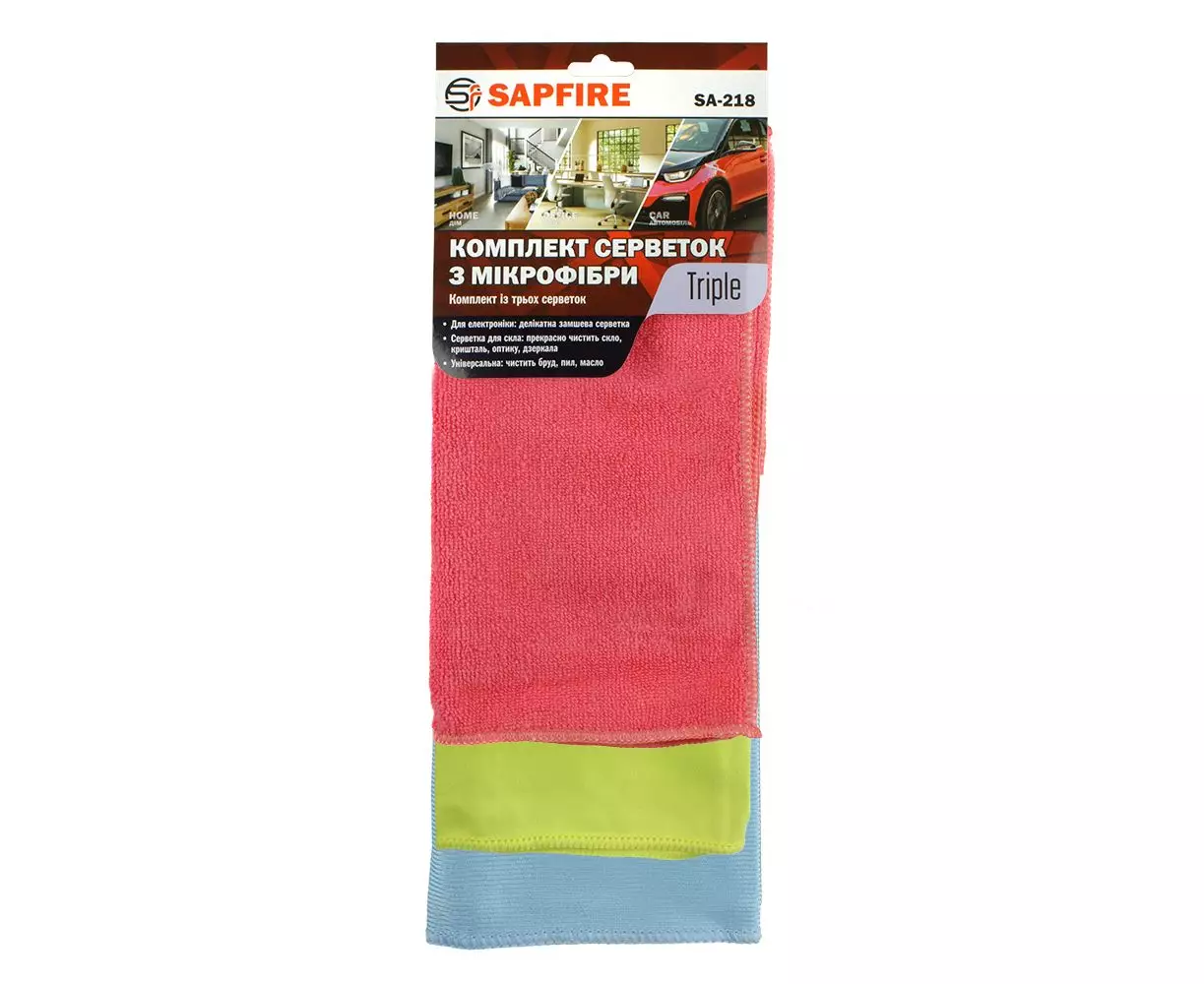 Салфетки из микрофибры SA-218 SAPFIRE Triple (002906) предназначены для очистки интерьера и экстерьера автомобиля, можно использовать в доме, офисе, на кухне.