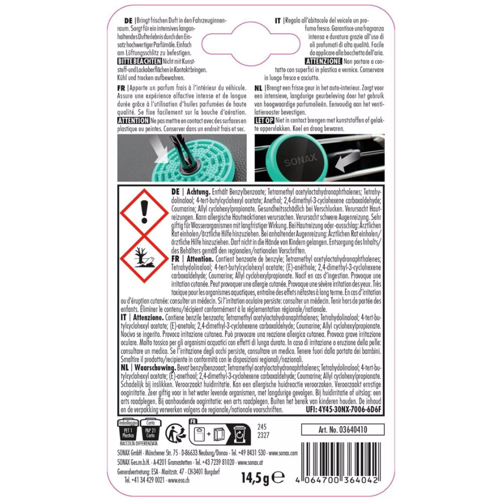 Ароматизатор Sonax Ocean Fresh — это идеальное решение для тех, кто ценит свежесть и чистоту в салоне автомобиля. Ароматизатор с освежающим морским ароматом создает ощущение прохлады и чистоты, как будто вы находитесь на берегу океана.