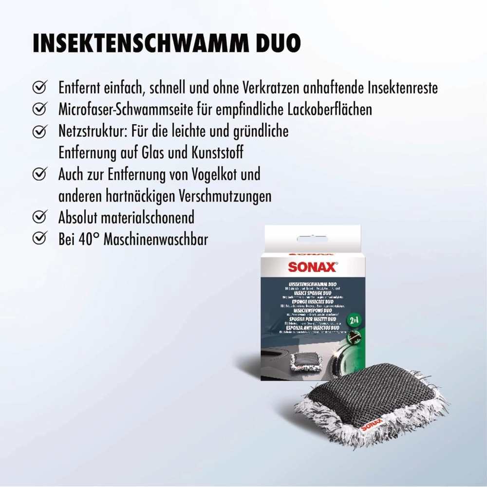 Смочите поверхность перед использованием и используйте только на влажных поверхностях. Смочите грязь, например, средством для удаления насекомых SONAX, и удалите легким нажатием. Поверхность из микрофибры: для бережной обработки чувствительных окрашенных поверхностей. Сетчатая структура: для легкого и тщательного удаления с стекла и пластика.