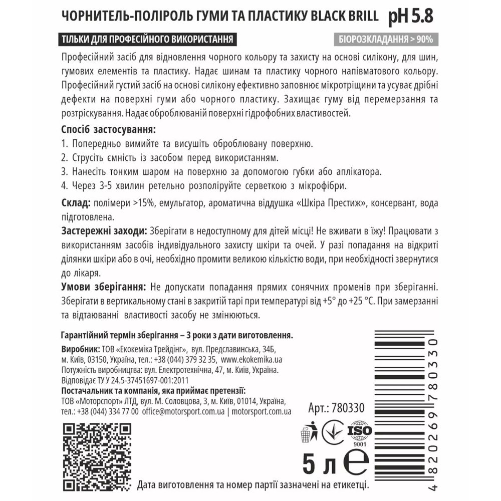 Ekokemika Pro-Line Black Brill – професійний чорнитель-поліроль для відновлення кольору і створення захисного шару на гумових і пластикових деталях автомобіля. Формула засобу забезпечує глибокий чорний колір, інтенсивний блиск та тривалу захисту від виваровування та зовнішніх факторів.