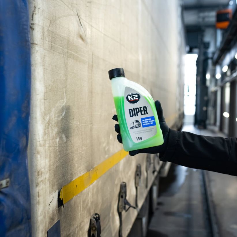 K2 DIPER - це потужний засіб в категорії засобів для чищення, виключно ефективний двокомпонентний висококонцентрований лужний миючий засіб з піноутворюючими властивостями. Воно легко справляється із забрудненнями, які традиційні засоби для чищення вже давно не можуть видалити. Його унікальна формула створена для видалення забруднень, що накопичилися у суворих умовах експлуатації транспортних засобів та обладнання. Концентрат K2 Diper видаляє навіть найстійкіші, старі і забруднення, що важко виводяться. Він ідеально підходить для очищення брезента, вантажівок або обладнання за допомогою пінного миючого засобу.