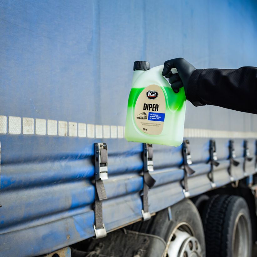K2 DIPER - це потужний засіб в категорії засобів для чищення, виключно ефективний двокомпонентний висококонцентрований лужний миючий засіб з піноутворюючими властивостями. Воно легко справляється із забрудненнями, які традиційні засоби для чищення вже давно не можуть видалити. Його унікальна формула створена для видалення забруднень, що накопичилися у суворих умовах експлуатації транспортних засобів та обладнання. Концентрат K2 Diper видаляє навіть найстійкіші, старі і забруднення, що важко виводяться. Він ідеально підходить для очищення брезента, вантажівок або обладнання за допомогою пінного миючого засобу.